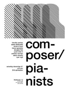 蒙 Douglas Fisk 的邀請,與一群作曲家一起開沙龍音樂會。大致上就是與上下三屆左右的同儕各表演鋼琴作品。元貞演了老作品《三點水》。不過礙於行程的關係,實在沒有練好。但也還是靠了臺風和臨機的變動做了一首的表演。Douglas 還邀了兩位哈佛的作曲研究生,大家也很興奮地談到明年說不定到波士頓演出的可能性。不過不論如何,我們四月25日會在紐約再辦一場。都彈老作品的大家,也都為這場未來的演出想譜新曲呢!